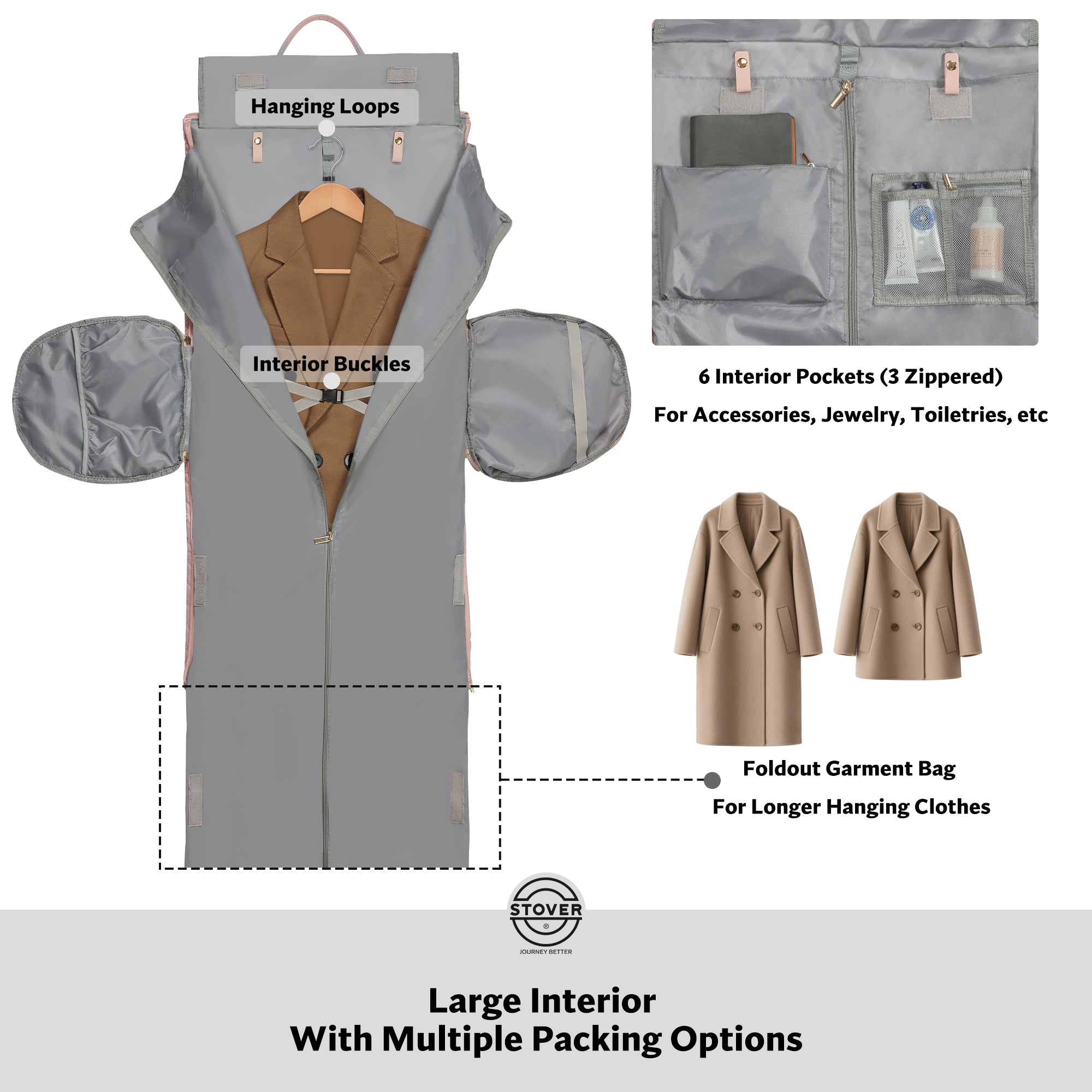 - HIGH QUALITY CONVERTIBLE GARMENT BAG: When laid open flat you can easily zip in hanging clothes to keep them wrinkle-free. Plus there are interior pockets to keep your jewelry and accessories neatly organized. And the lay-flat foldable design makes it easy to store when not in use.