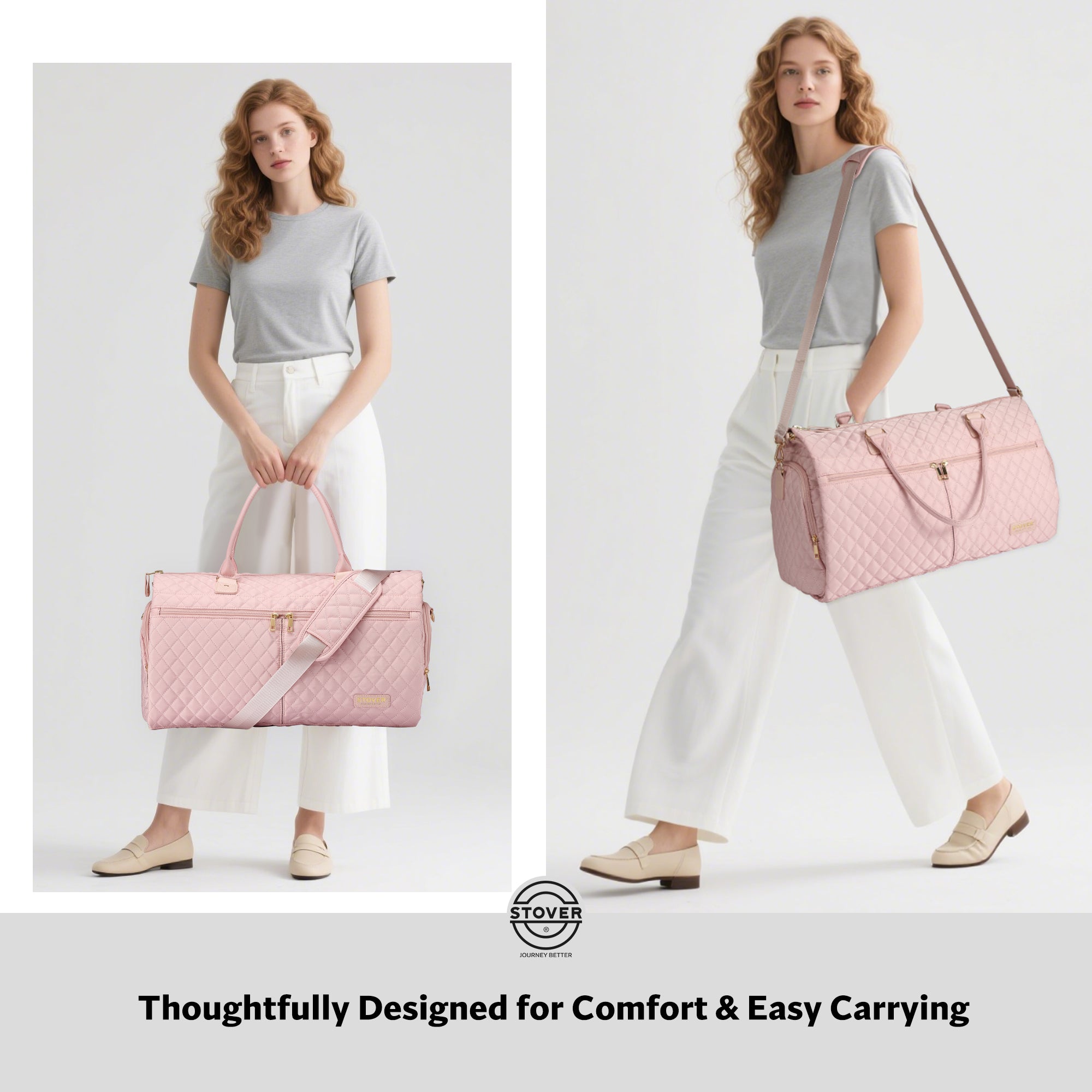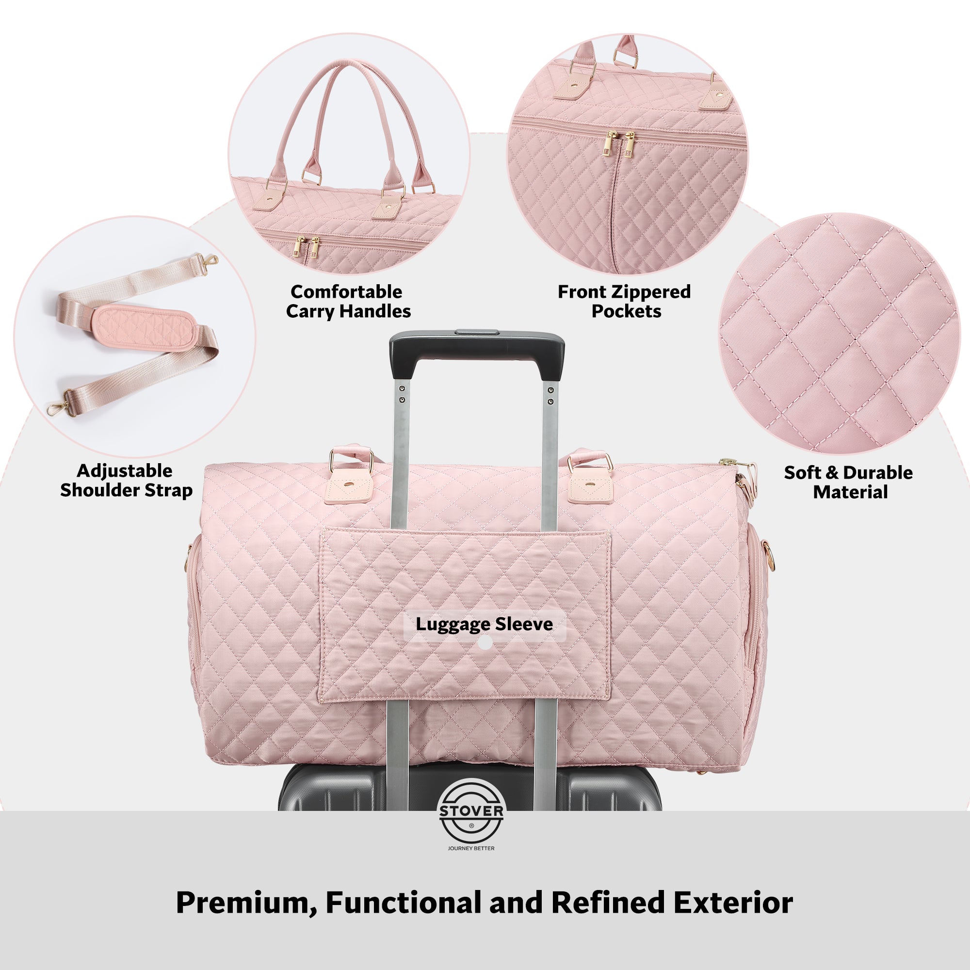 - EXTRA LARGE CAPACITY DUFFEL BAG: Once zipped up this carry on garment duffle bag has a large capacity, giving you lots of room for folded clothes, accessories & any other travel needs. It easily fit outfits for 4-6 days away. Note: this bag is too large to be used as a Personal Item during air travel, but works as a Carry-On for most airlines if the bag is not overpacked.