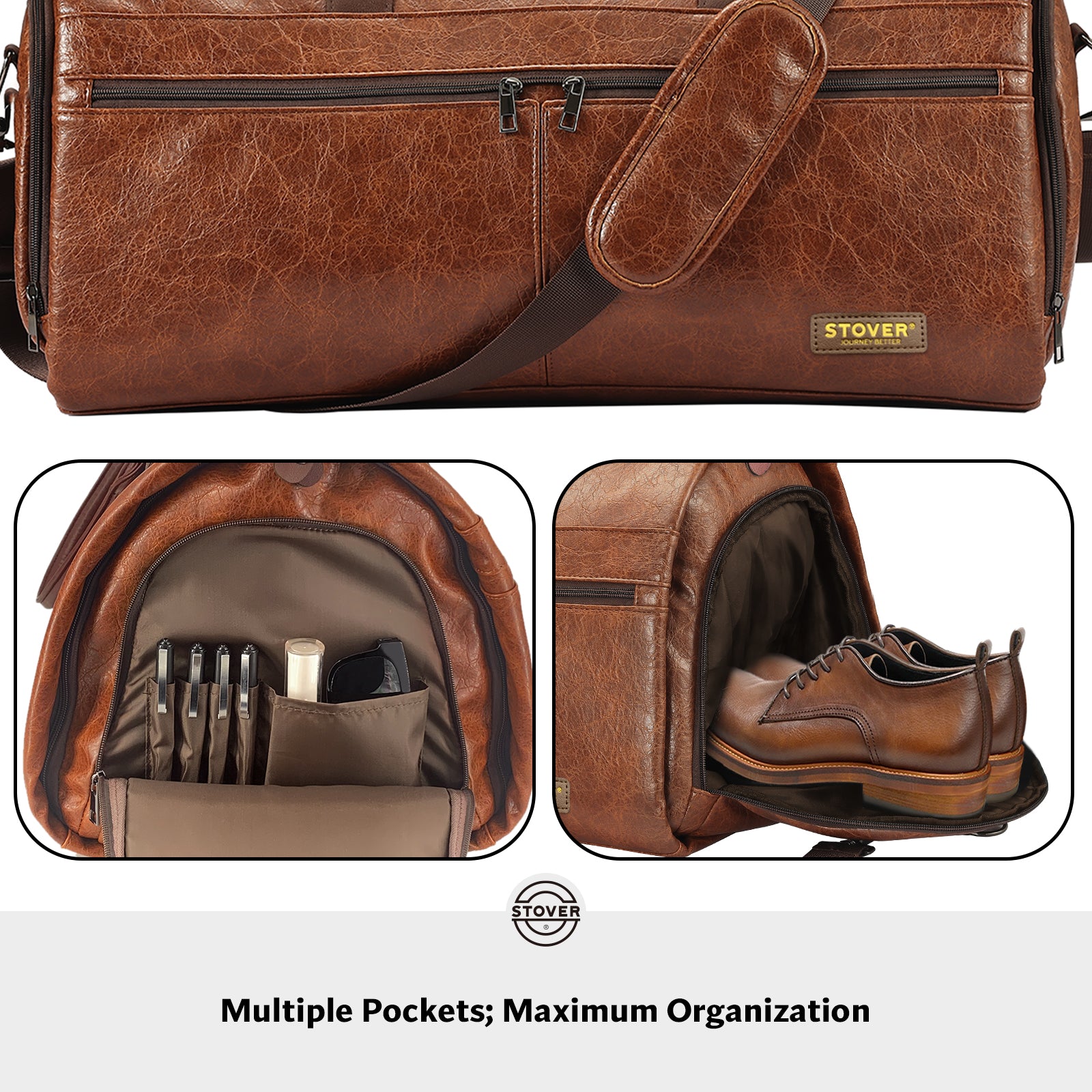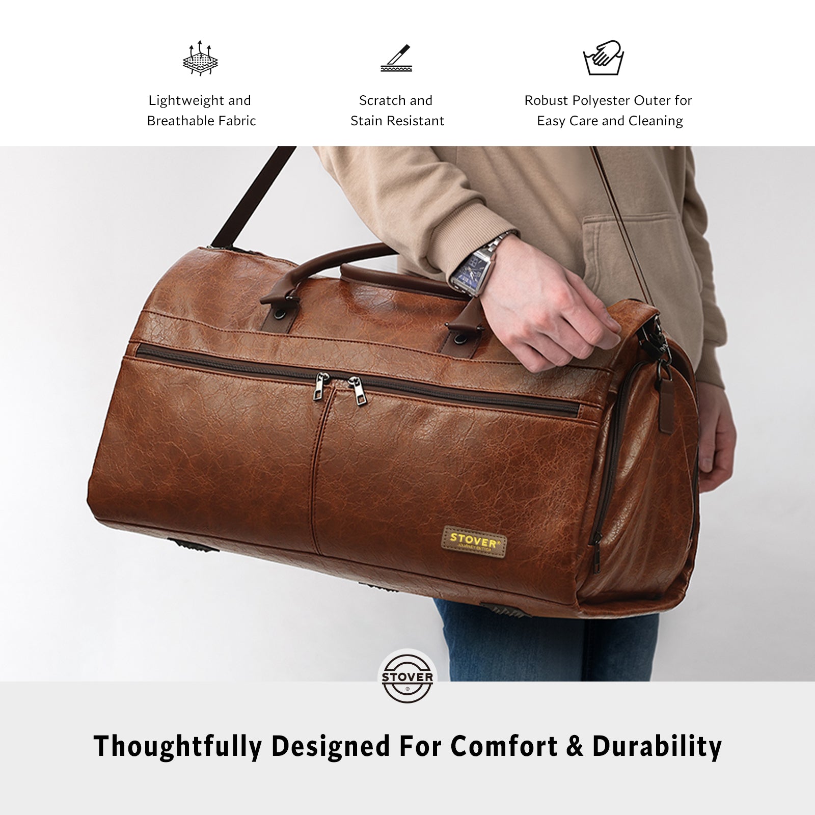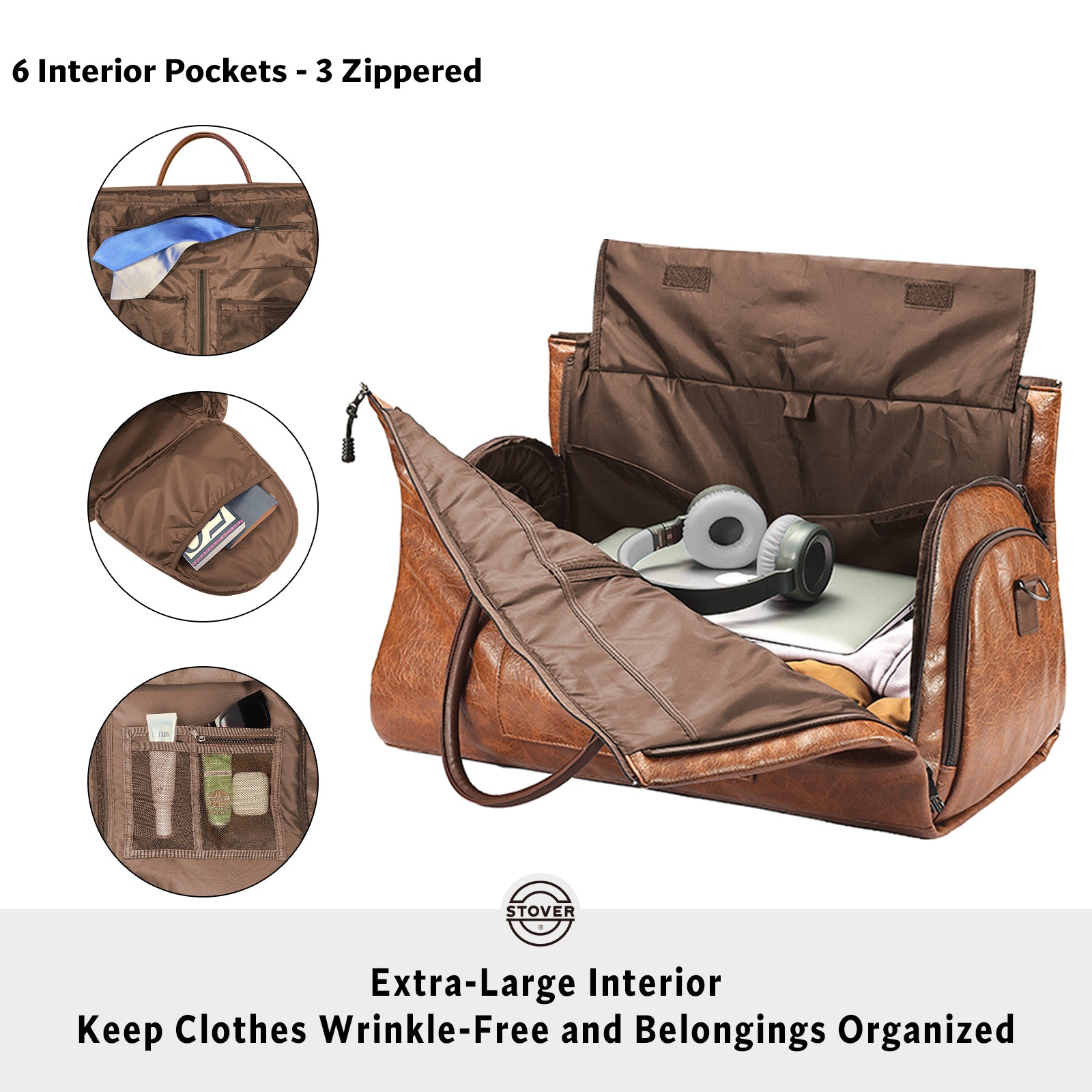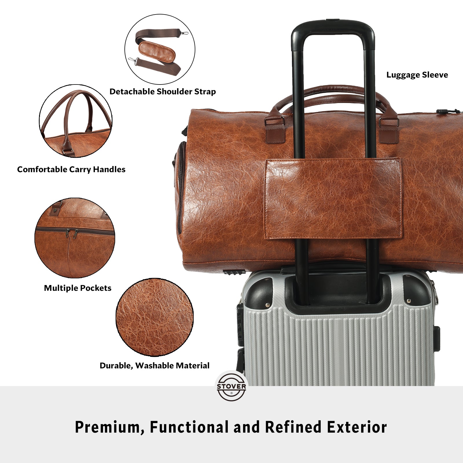 - EXTÉRIEUR HAUT DE GAMME, FONCTIONNEL ET RAFFINÉ : L'extérieur en similicuir comporte de multiples poches, des poignées de transport confortables, une bandoulière amovible et réglable ainsi qu'une pochette pour bagage/chariot pour attacher votre sac à la poignée d'une valise. Son design élégant et polyvalent rend ce sac de week-end parfait pour toutes les occasions.